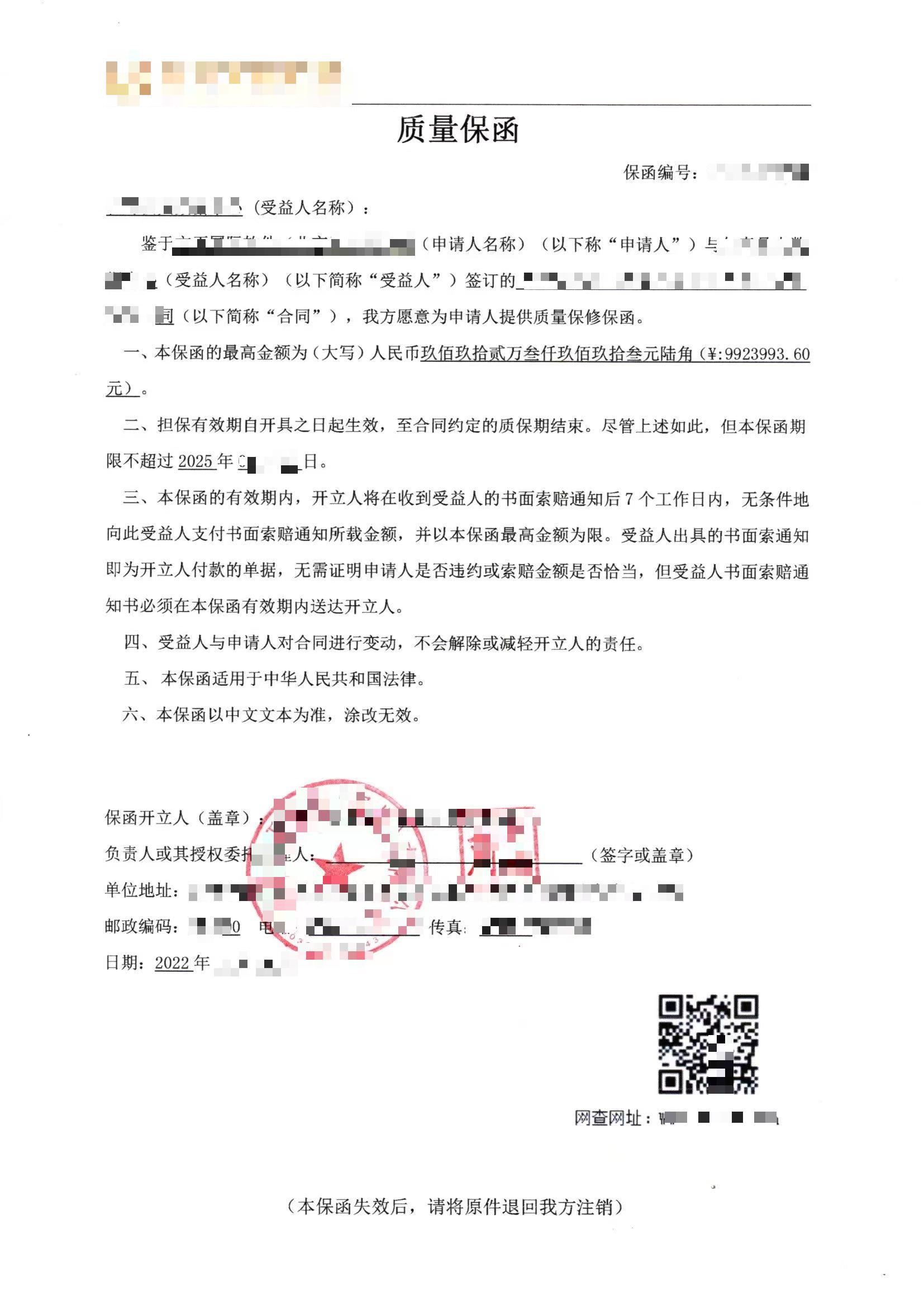 990万商业质量保函